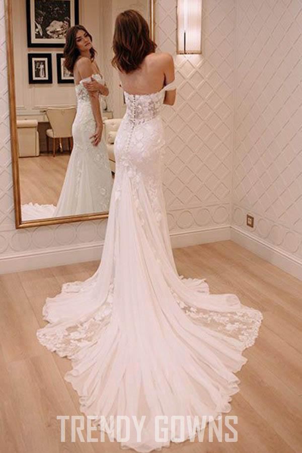 Off Shoulder Court Train Lace Appliques Chiffon Wedding Gown TWA2202