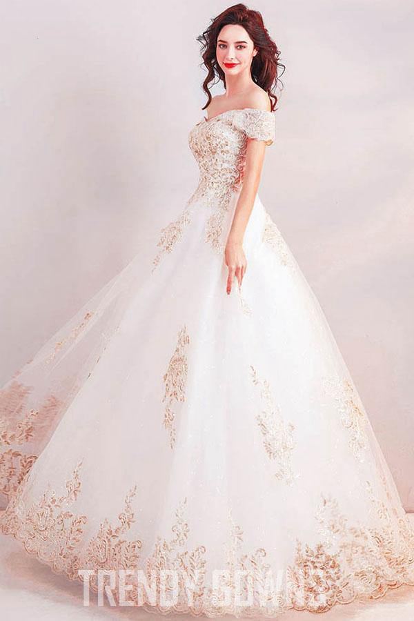 Off the Shoulder Ball Gown Gold Appliques Wedding Gown TWA3682