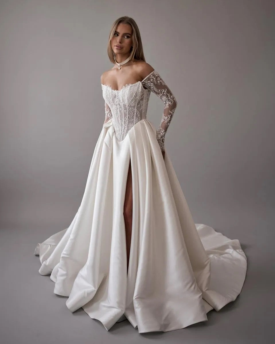Off-the-shoulder Long Sleeve Satin Basque Waist Wedding Dress BWD308