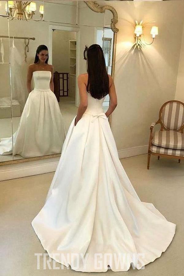 Trendy A-line Strapless Open Back Satin Ivory Wedding Gown with Pockets TWA3952