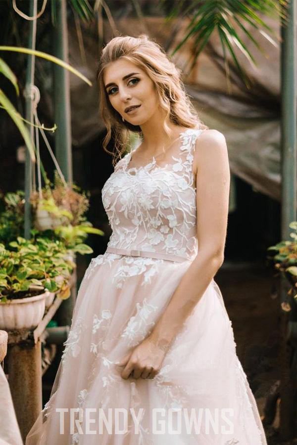 Trendy Beach Lace Scoop A Line Tulle Wedding Gowns TWA5312
