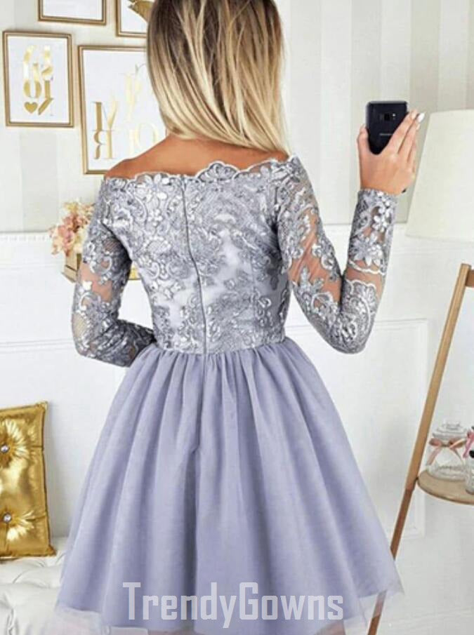 Trendy Long Sleeve Silver Lace Junior Short Prom Dress JTSH138