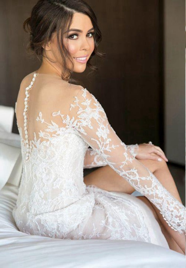 Trendy Long Sleeve Split Sheath Lace Bridal Gowns TWA083