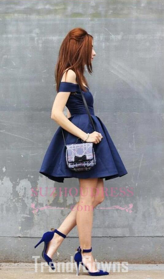 Trendy Navy Blue Off the Shoulder Teen Short Prom Dress JTSH022