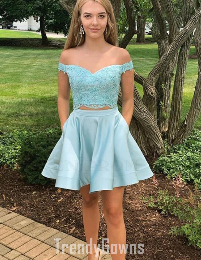 Trendy Off the Shoulder Short 2 Piece Lace Junior Prom Dress JTSH094
