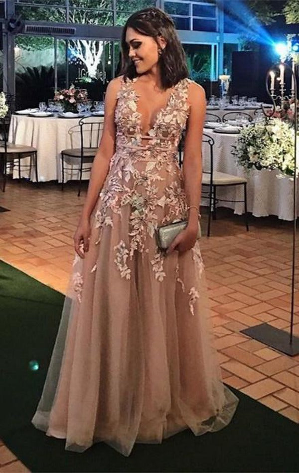 Trendy Plus Size Lace Appliques A-line Straps Prom Gowns JTE540