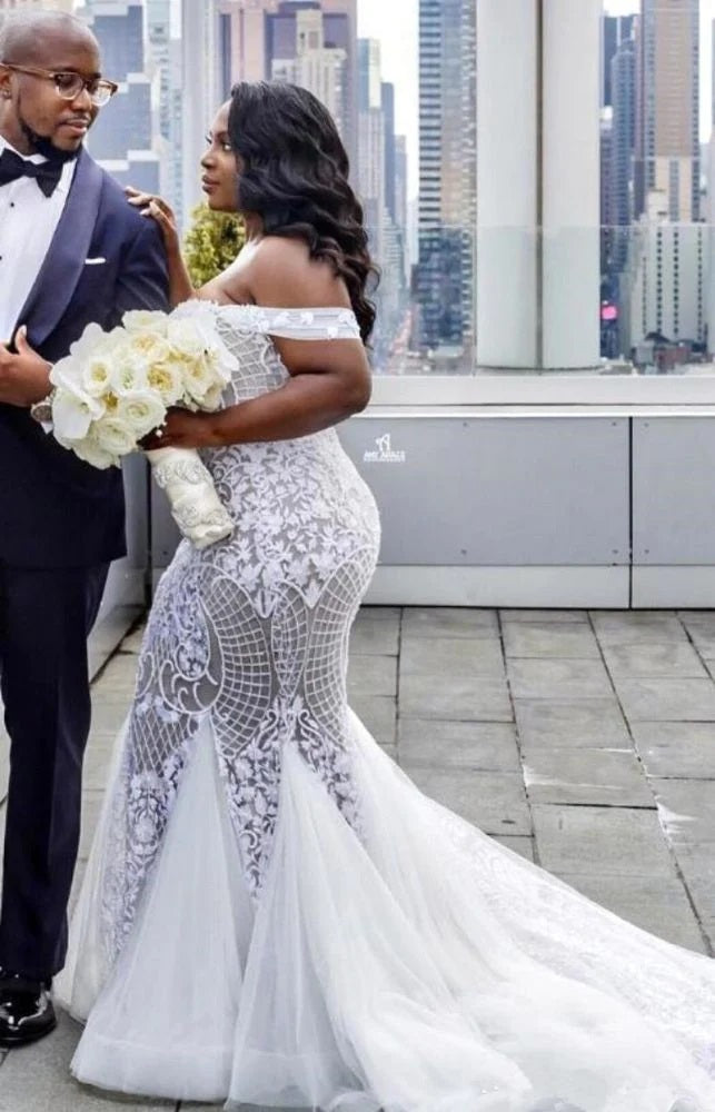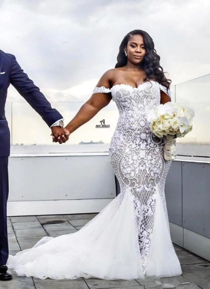 Trendy Plus Size Off the shoulder Mermaid Lace Wedding Gown TWA260