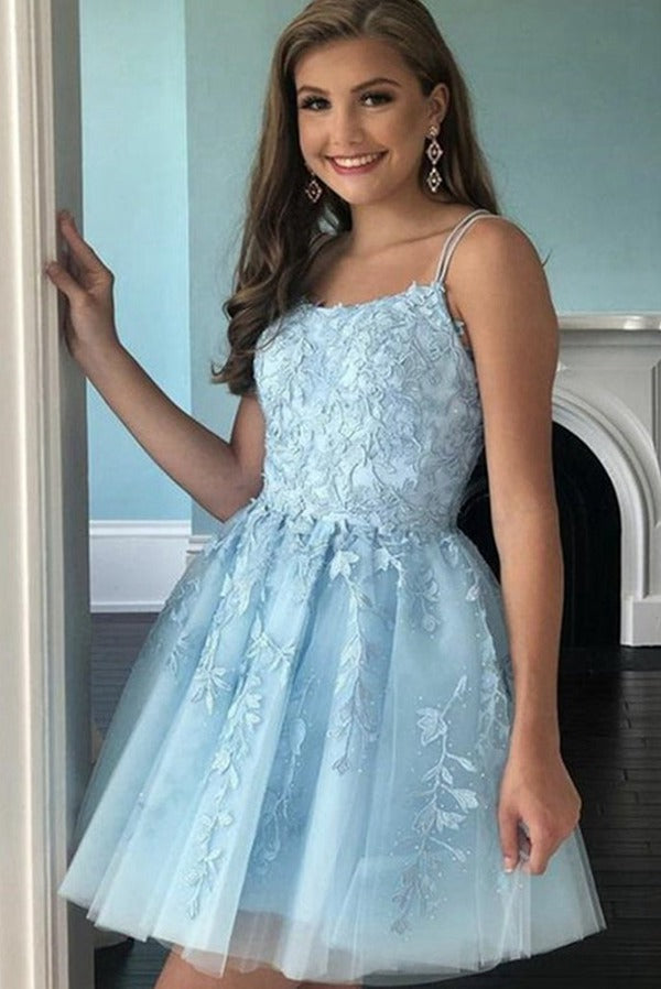 Trendy Short Blue Lace Junior Prom Dress JTSH097