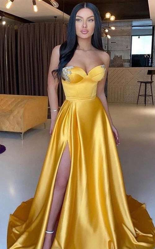 Trendy Yellow A-line Satin Slit Prom Gown JTE825