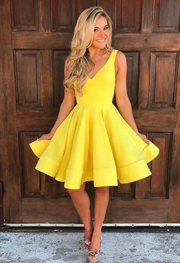 Trendy Yellow V Neck Junior Short Prom Dress JTSH063
